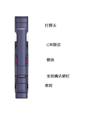 當(dāng)下鉆或者起鉆時(shí),打撈筒與本體處于拉伸狀態(tài),鎖塊縮回芯軸本體。在坐掛時(shí),打撈頸被A型工具震擊下壓,打撈頭下移,把鎖塊漲出,懸掛在AF工作筒里。C環(huán)限位。使得打撈頭始終推開(kāi)鎖塊懸掛。